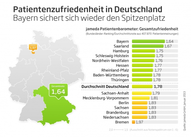 Das jameda Patientenbarometer erhebt jedes Trimester die Stimmung der Patienten in Deutschland. Wie zufrieden sind die Patienten in den einzelnen Bundesländern? Wie beurteilen sie die einzelnen Facharztgruppen? Sind die Privatpatienten wirklich zufriedener? In welcher Stadt sind die Ärzte besonders kinderfreundlich? Diesen und vielen weiteren Fragestellungen geht das Patientenbarometer nach und gibt damit ein umfassendes Bild zur Patientenzufriedenheit in Deutschland. Basis der Auswertung sind die ausführlichen Bewertungen auf Deutschlands größter Arztempfehlung jameda.