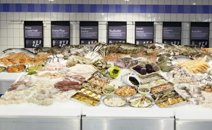 Fischartikel. Bedient werden die Kunden an den real,- Fischtheken von