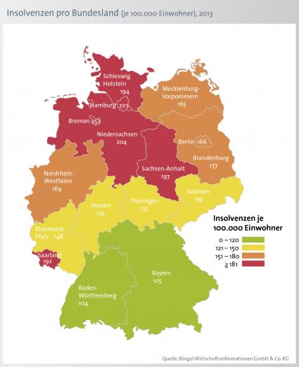 Der Bundesdurchschnitt lag im Jahr 2013 bei 151 Insolvenzen je