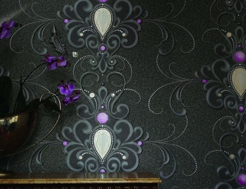 Die raffinierte Technik einer ganz neuen Applikationsmaschine macht es darüber hinaus möglich, fertig gedruckte Tapeten in einem weiteren Arbeitsgang zum Beispiel durch Glaskristalle zu verfeinern. Das Design wird akzentuiert und es entstehen kleine Tapetenkunstwerke. Gleichermaßen ist es hier möglich mit Perlen oder Glaskristallen ganz eigene Muster zu gestalten. Der Marburger Tapetenfabrik ist es gelungen, Perlen und Kristalle im Rapport punktgenau zu setzen, und ist dank dieser Technik einmal mehr Innovationsführer der Branche.