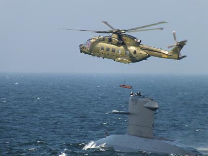 über dem Uboot schwebt. Mit einem Arzt im Helikopter fliegt der