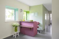 Im großen Behandlungsraum werden zum neuen Holzdielenboden ein zarter Grünton und ein intensiver grüner Akzent eingesetzt. So entsteht eine ausgewogene lebendige bis aktive Farbstimmung, die bewegungsintensive Behandlungen unterstützt und den Raum strukturiert. Im benachbarten Therapieraum schafft dagegen der dunkle Purpurton (3D Rose 105) der Akzentfläche eine umhüllende Atmosphäre. Er verbindet ganz natürlich die frischen Trendfarben mit den Farbigkeiten und Materialien der alten Schule. Ähnlich einem Wohnzimmer, soll so das Wohlbefinden der Patienten bei der Behandlung gefördert werden. Herzstück der Praxis und charmantes Bindeglied zur alten Schule bildet der Empfangsbereich mit der Theke als Blickfang. Der dunkle Purpurton wurde hier wieder aufgegriffen. Dieser Farbton wirkt warm und ausgleichend zu den belebenden Grün- und Blautönen der umgebenden Wände und zum grauen Fliesenboden - der Tresen wird so zum Anziehungspunkt. Er ist eigens für die Praxis angefertigt worden - die horizontalen Ablageplatten sind aus alten Schulbänken gezimmert. Wer genau hinsieht kann sogar noch die eingeritzten Botschaften der Schüler von damals erkennen.