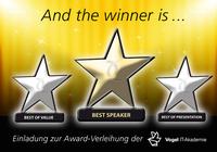 (PresseBox) - Im Nachgang der diesjährigen Veranstaltungen "Storage Technology Conference 2014", "Storage Solutions Day Fachkongress - Swiss 2014" und "IT-Security Management & Technology Conference 2014" der Vogel IT-Akademie (Augsburg) bewerteten die Teilnehmer per digitalen Fragebogen die einzelnen Referenten. Die Gewinner stehen nun fest, werden ausgezeichnet und bei zukünftigen Veranstaltungen als Preisträger gekennzeichnet.