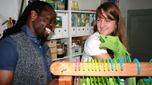 Bildunterschrift: Modedesigner Alfredo Mahumane und Produktdesignerin Anne Sommer im kreativen Austausch. Der kleine Frosch am Ärmel ist Teil vonSommers Spielmode