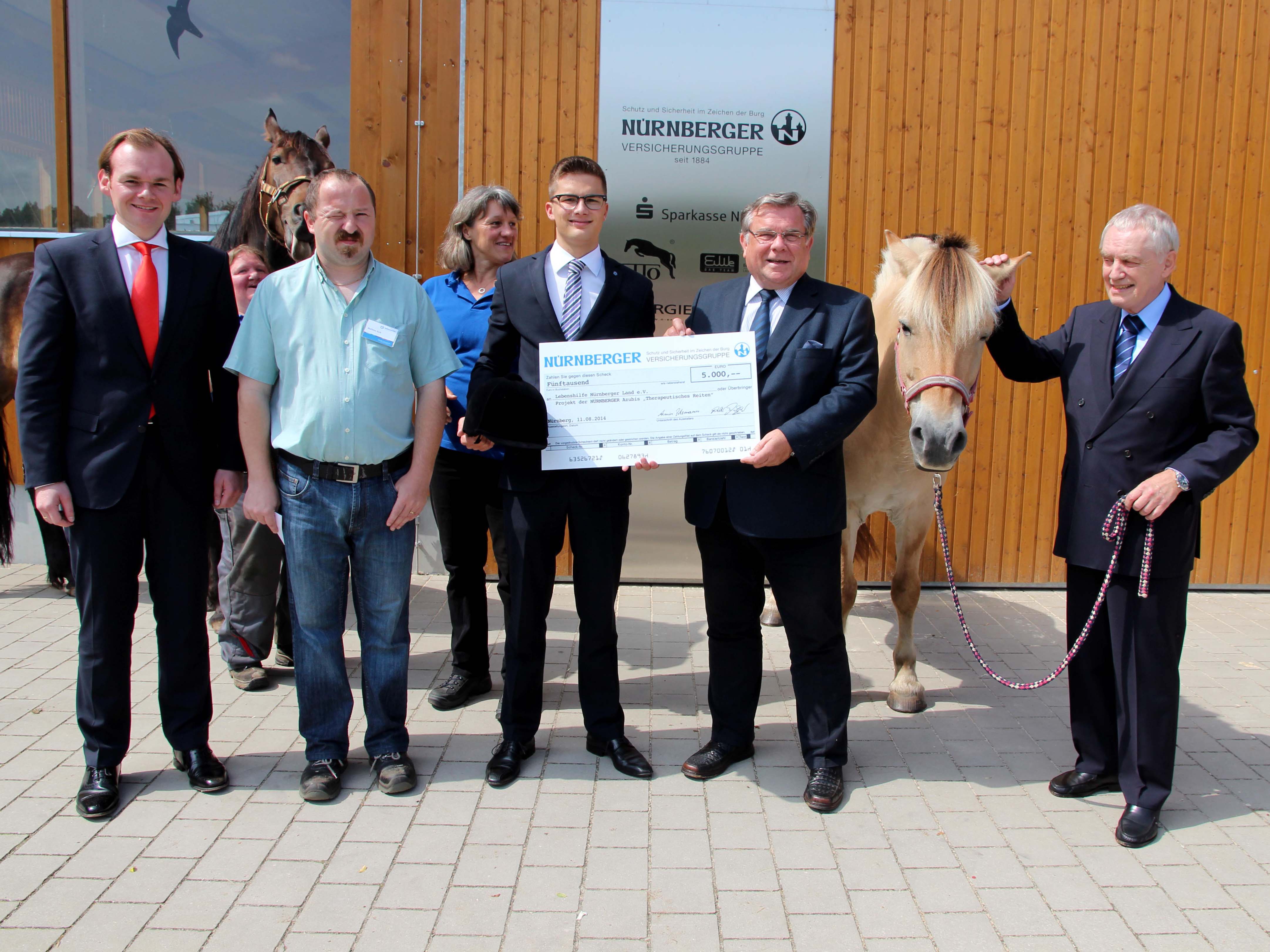 Gerhard John, Petra Hoffmann, Dennis Kummarnitzky, Iris Hofmann und Matthias Kick von der Lebenshilfe Nürnberger Land dankten bei der Scheckübergabe auf dem Lebenshilfe-Gelände in Lauf a. d. Pegnitz Hans-Peter Schmidt, Aufsichtsratsvorsitzender der NÜRNBERGER und Azubi-Sprecher Philipp Schmidt für deren großzügige Spende und das ehrenamtliche Engagement. Betreutensprecher Matthias Kick: "Die Reittherapie tut uns gut. Es ist schön, dass wir Sie, die NÜRNBERGER, als Freunde haben."