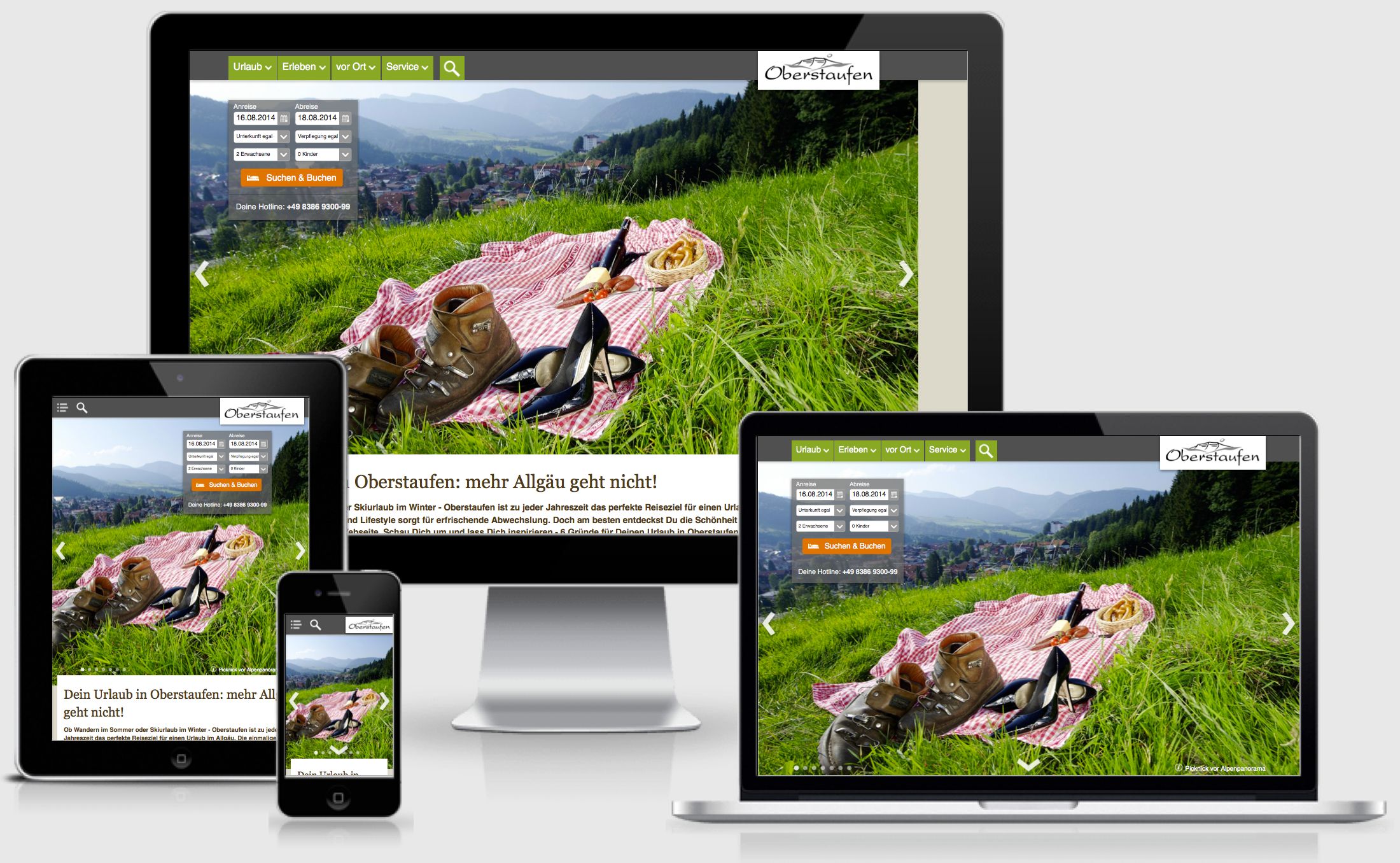 Der Allgäuer Lifestyle- und Wellnessort sieht sich gerne als "digitalster Kurort Deutschlands". Die neue www.oberstaufen.de unterstreicht eindrucksvoll, wie Informationen mit Bildern aufgepeppt werden können. Alle Seiten und alle Artikel werden mit bildschirmfüllenden Fotos eingeleitet egal, ob die Seite auf dem Smartphone, auf dem Tablet-PC oder dem Großbildschirm an der Wohnzimmerwand ausgespielt wird. Auch fast alle Fotos in den Artikeln lassen sich per Mausklick auf Großformat beamen.