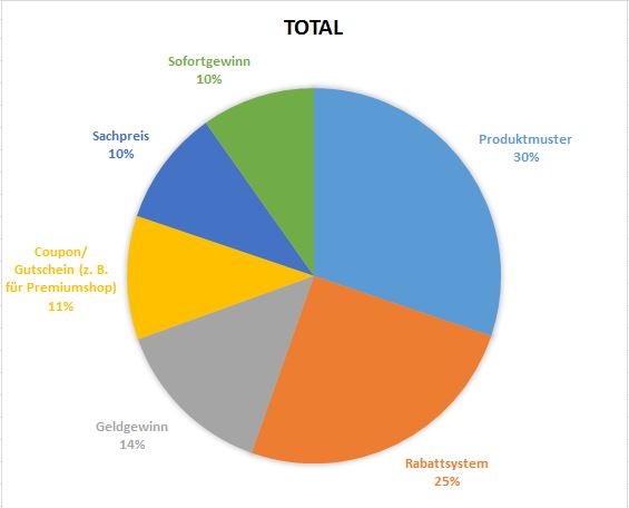 Besonders gut kommen bei deutschen Konsumenten Produktmuster (30%) und Rabattsysteme (25%) an. Coupons (11%) ebenso wie Sachpreise und Sofortgewinne (jeweils 10%) sind weniger beliebt und landen auf den hinteren Plätzen. Für besonders sinnvoll halten die Verbraucher die Zugaben bei Lebensmitteln und Pflegeprodukten (jeweils 58%), Haushaltswaren (34%) sowie Genussmitteln (33%). Weniger attraktiv sind die Extras bei Zeitschriften und Online-Medien. Bei der Art der gewünschten Zugabe kommen bei Lebens- und Genussmitteln vor allem Sachpreise an (63% bzw. 44%), bei Pflegeprodukten sind Produktmuster gern gesehen (70%) und bei Haushaltswaren Geldgewinne (36%).