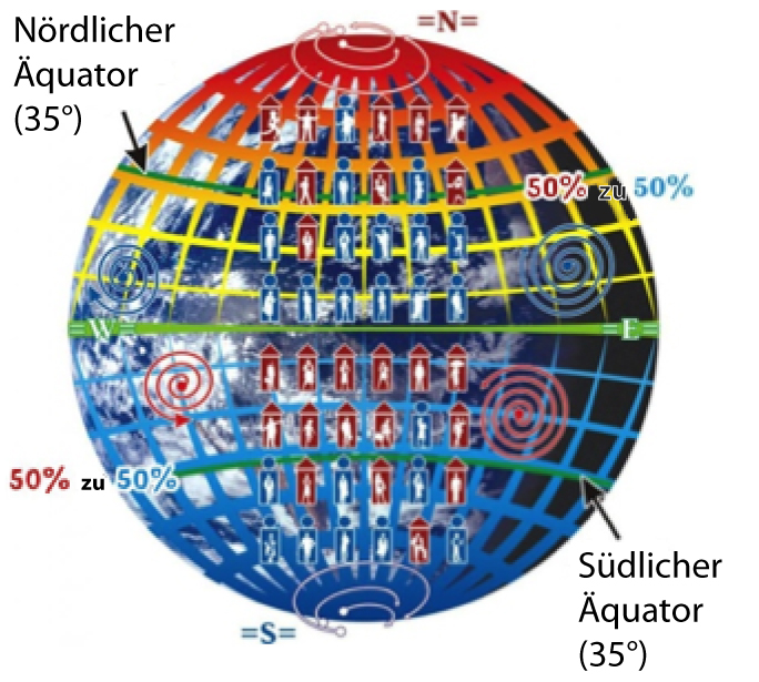 - Die Verteilung der Biosphärischen Dissymmetrie hängt vom Breitengrad, vom Abstand von der Erdoberfläche und der jeweiligen Erdhalbkugel ab (nördliche und südliche).