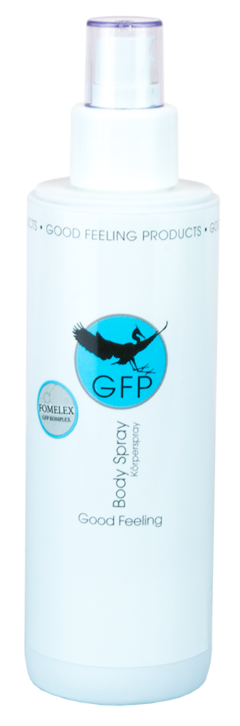Erfrischend einfach: das weiterentwickelte Good Feeling Body Spray hilft ihrer Haut einfach noch cooler zu bleiben. Es versorgt die Haut optimal mit Feuchtigkeit, nach dem Duschen, nach dem Sport oder einfach zwischendurch in den Wintermonaten, in denen die Haut besondere Pflege benötigt. Seine pflegenden Eigenschaften sind mittels des GFP-Komplexes eine Wohltat für die durstige Haut. Grundlage und ?Hauptzutat? des GF Body Sprays ist der ?GFP-Komplex?. Dieser setzt sich aus rein natürlichen und nachwachsenden Inhaltsstoffen ? genauer aus dem der Zellwand des Zunderschwamms entnommenen 1,3-/1,6-beta-D-Glucan-Chitin-Melanin ? zusammen, die über eine Wirkstoffkette ihren einzigartigen sowohl äußerlichen wie auch innerlichen Effekt entfalten, und hilft die Inhaltsstoffe des Produkts in tiefere Hautschichten einwirken zu lassen. Das trägt vor allem dazu bei, dass die natürliche Hautregeneration in Gang kommt und Hautirritationen lindert. Die Besonderheit des GFP-Komplexes ist, dass die Bestandteile als Kette in einer kompletten Einheit gewonnen werden und nicht in Teile aufgespalten sind. Damit ist die Bioaktivität sowohl der einzelnen Wirkstoffe als auch der Wirkstoffkette nachweislich sehr hoch. Weltweit ist dieses Herstellungsverfahren das Einzige, das die einzelnen Wirkstoffe in dieser reinen Form gewinnen kann.