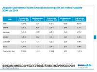 Datenbasis für die Berechnung der durchschnittlichen Angebotspreise waren die jeweils im ersten Halbjahr 2009 bis 2014 auf immonet.de inserierten Mietangebote bei Wohnungen von 60 bis 120 Quadratmeter in den genannten Städten. Die Mietpreise sind Netto-Kaltmieten bei Neuvermietung für unmöblierte Wohnungen. Die Städte sind die größten Städte in Deutschland über 500.000 Einwohner (Stand: 31.12.2012; Quelle: Statistisches Bundesamt).