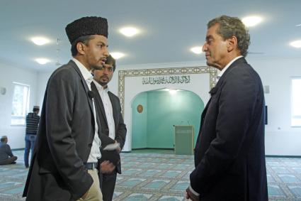 Muslime in ihrer Moschee, er spricht mit jungen Anhängern des Islam,