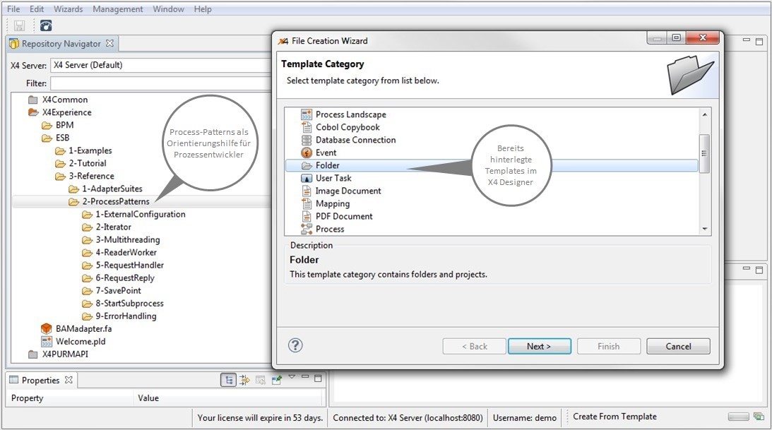 (firmenpresse) - Häufig wiederholen sich die zu lösenden Aufgaben in Projekten. Die X4 BPM Suite bietet mit den Integration Patterns und den Prozessbibliotheken zwei Funktionen, um die Wiederverwendung von fachlichen und technischen Prozessmodellen zu vereinfachen.