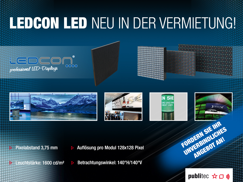 (firmenpresse) - (NL/3285144687) Wir haben uns für ein 3mm Indoor-Produkt der Firma LEDCON entschieden, erläutert publitec-Geschäftsführer Jens Richter. Aus der Vielzahl der möglichen Lieferanten hebt sich LEDCON durch eine hervorragende Bild-Qualität bei einem enorm guten Preis-Leistungs-Verhältnis ab. Man merkt diesem Lieferanten an, dass er langjährige Erfahrung bei der Vermarktung von LED-Produkten aus Fernost unter deutschen Qualitätsansprüchen hat. Für uns war absolut ausschlaggebend, dass Entwicklung, Service und Ersatzteilversorgung in Deutschland beheimatet sind. Unsere Kunden sind Veranstaltungsprofis und können sich keine Experimente leisten.