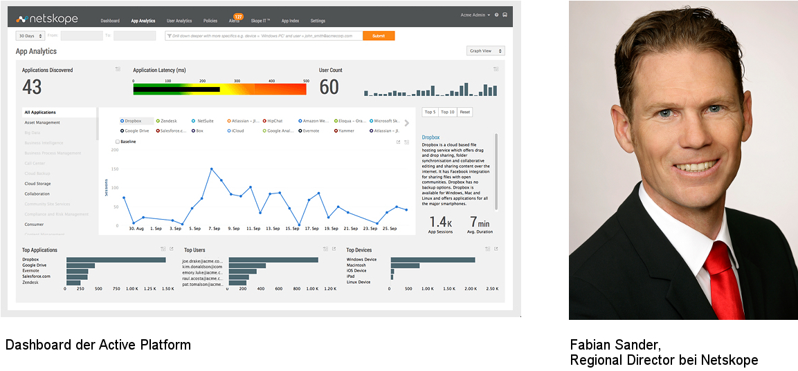 Die Active Platform des kalifornischen Anbieters hilft Unternehmen dabei, die Nutzung aller Cloud-Apps transparent darzustellen. Die Software besteht aus drei Kernkomponenten: Die Funktionsebene "Discovery" identifiziert zunächst sämtliche Cloud-Services, die auf Geräten im Firmennetzwerk genutzt werden. Wie und wofür Mitarbeiter die Apps einsetzen, stellt anschließend die Software-Komponente "Active Visibility" dar. Mit "Active Analytics" können Unternehmen alle gewonnenen Daten für weitergehende Analysen zusammenfassen. Darüber hinaus lassen sich spezielle Regelwerke einrichten, die nur freigegebene Cloud-Anwendungen zulassen.