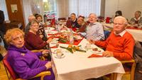 "O Tannenbaum, o Tannenbaum", klingt es vielstimmig durch den Raum. Auf den Tischen liegen die Texte bekannter Weihnachtslieder. Es wird erzählt, gesungen und gelacht. Kaffee- und Kuchenduft zieht über die Tische. Höhepunkt der Feier ist der Auftritt des Weihnachtsmannes mit Knecht Ruprecht, verkörpert von den Freudenberg-Mitarbeitern Richard Densch und Erich Ballmann. Während die Gäste die humorvollen Verse genießen und lachen, kommen die beiden Mitarbeiter des Werk- und Brandschutzes der Freudenberg Gruppe ins Schwitzen. Densch steckt als Nikolaus im Bischofsmantel und trägt eine Mitra auf dem Kopf. Ballmann ist als Ruprecht in einen zotteligen Pelzumhang gehüllt. "Die traditionelle Weihnachtsfeier ist immer ein Erlebnis", sagt Lore Lederer. Die Achtzigjährige trägt ein Gedicht vor und sagt dann: "Danke an alle, die den Freitisch möglich machen." Damit alles funktioniert sind die Freudenberg-Mitarbeiterinnen Ulla Jeffery und Alicia Storch im Einsatz: Sie begrüßen die Teilnehmer mit Namen, gießen Kaffee ein und verteilen Kuchen.