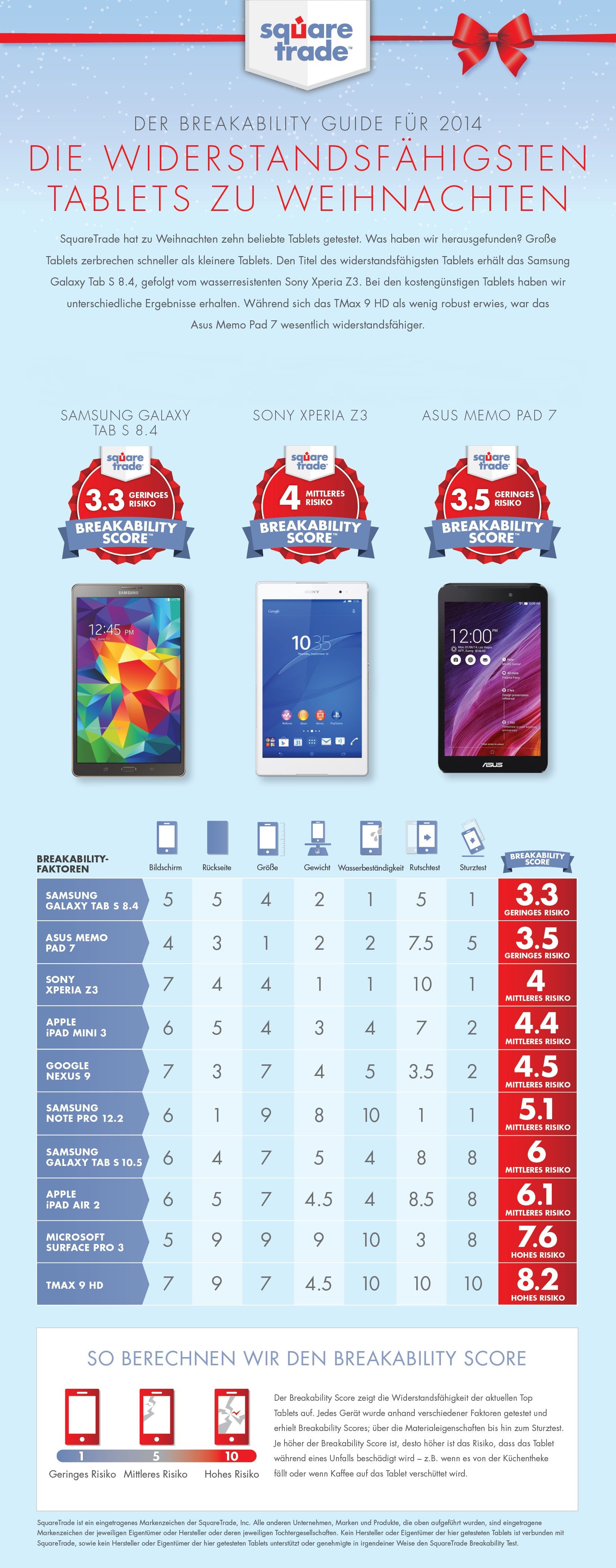 Nach dem Samsung Galaxy Tab S 8.4 versprechen laut des Tests von SquareTrade auch das robuste und wasserunempfindliche Sony Xperia Z3 (Breakability Score von 4) und das Apple iPad Mini 3 (Breakability Score von 4.4) länger als nur ein Weihnachten Freude zu bescheren. Wer ein preiswertes und dennoch robustes Tablet sucht, ist mit dem Asus Memo Pad 7 (Breakability Score von 3.5) sehr gut bedient. Das TMax 9 HD und das Microsoft Surface Pro 3 (Breakability Score von 7.6) sind dagegen wohl eher schlechter geeignet, um einem etwaigen Weihnachtsstress zu trotzen.