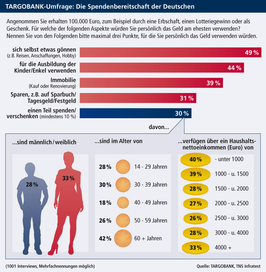 Die Umfrage wurde von TNS Infratest Finanzforschung im Auftrag der TARGOBANK als repräsentative Bevölkerungsbefragung (1001 Interviews) durchgeführt. Gefragt wurden die Deutschen, wofür sie 100.000 Euro aus einer Erbschaft, Schenkung oder einem Lottogewinn verwenden würden.