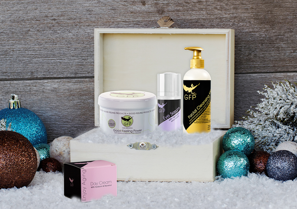 Weihnachten mit Good Feeling Products wird dieses Jahr noch schöner! Mit dem speziellen Weihnachtsgeschenkset bestehend aus dem Good Feeling Power, der Enjoy Aging Day Cream, dem Enjoy Aging Eye Serum und der Enjoy Aging Facial Cleansing Milk ist der perfekte Start ins neue Jahr garantiert. Diese Edel-Anti-Aging-Helfer ergänzen sich wunderbar, sind echte Feuchtigkeitsspender und sorgen für das ganz private Spa-Gefühl.