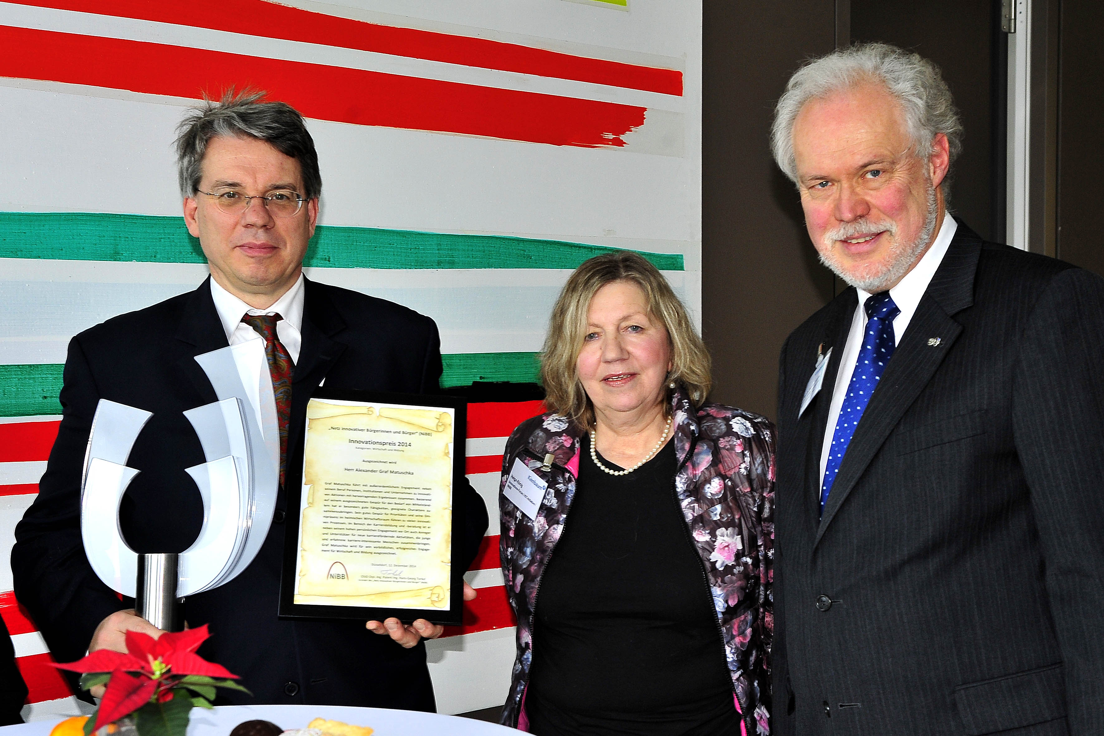 Düsseldorf, 15.12.2014. ? Alexander Graf Matuschka ist Preisträger des NiBB-Innovationspreises 2014. Ausgezeichnet wurden seine außerordentlichen Leistungen für den Karrierestart junger Leute und für Unternehmen. Der Principal der Kienbaum Executive Consultants GmbH erhielt den Preis in der Kategorie Bildung und Wirtschaft am vergangenen Freitag in Düsseldorf aus den Händen von Helga König, Sonderbotschafterin des Netzwerkes innovativer Bürgerinnen und Bürger (NiBB), und Vorjahrespreisträger Prof. Dr. Reinhard Spörer vom Campus Soest der Fachhochschule Südwestfalen. Das NiBB wurde 2000 von Hans-Georg Torkel (KIT-Initiative Deutschland e.V.) ins Leben gerufen.