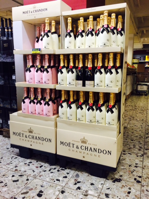 Als die Verantwortlichen von Moët Hennessy Deutschland auf die neue 1.4 Viertelpalette von Pooling Partners aufmerksam wurden, entschieden sie sehr schnell: Seit nunmehr einem Jahr werden, nach rund 20 Jahren Einsatz anderer Viertelpaletten, ausschließlich die grauen Paletten von Pooling Partners eingesetzt, die den Displays ein noch attraktiveres und eleganteres Erscheinungsbild verleihen.