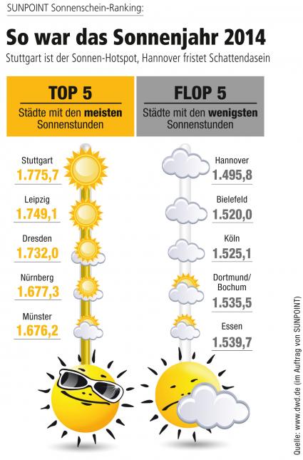 "SUNPOINT Sonnenschein-Ranking: So war das Sonnenjahr 2014 / Stuttgart ist der Sonnen-Hotspot, Hannover fristet Schattendasein (FOTO)"