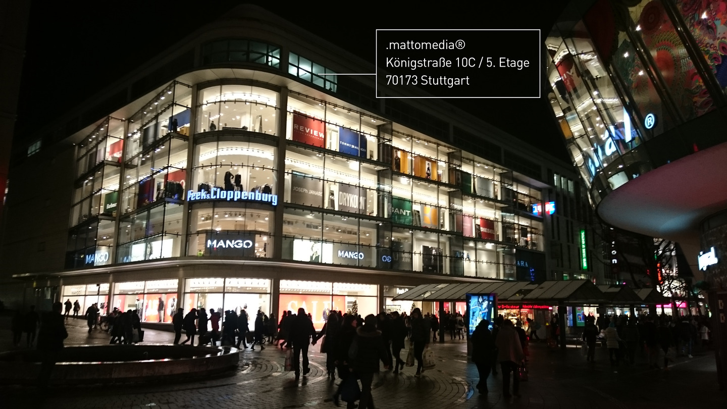 Mitten in der Stuttgarter City gelegen, befindet sich .mattomedia® im fünften Stock eines der schönsten Gebäude der gesamten Straße. Die großzügige Terrasse erlaubt den Blick auf Stuttgart und die umliegenden Hügel, die als Halbhöhenlage bundesweit Bekanntheit als eine der begehrtesten Quartiere erlangt haben. Besucher können ihr Fahrzeug in der Tiefgarage parken oder haben es nur zwei Minuten zu Fuß, wenn sie mit öffentlichen Verkehrsmitteln anreisen.