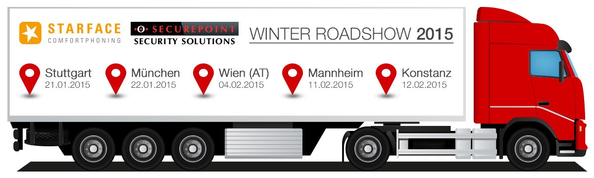 Im Rahmen der STARFACE Winter Roadshow 2015 informiert die SECUREPOINT GmbH im Januar und Februar 2015 zusammen mit seinen Technologiepartnern HFO Telecom, Patton, Securepoint, StentofonBaudisch und Yealink über neue Lösungen rund um Unified Communications & Collaboration (UCC).