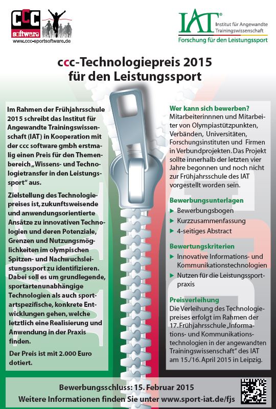 (firmenpresse) - Spitzensport braucht Spitzentechnologie, so das Motiv der CCC Software GmbH (http://www.ccc-software.de/de/sport/) , 2015 erstmalig diesen Technologiepreis zu stiften. In Zusammenarbeit mit dem IAT geht es bei diesem Wettbewerb darum, zukunftsweisende und anwendungsorientierte Ansätze zu innovativen Technologien (http://www.ccc-software.de/de/sport/sportsoftware/projekte-loesungen.php) und deren Potentiale und Nutzungsmöglichkeiten im olympischen Spitzensport zu identifizieren. Sportartenübergreifende Grundlagenforschung ist dabei ebenso willkommen, wie konkrete sportartenspezifische Entwicklungen. Bewerben können sich Mitarbeiter von Olympiastützpunkten und Sportverbände, universitärer und außeruniversitärer Forschungseinrichtungen sowie Firmen in Verbundprojekten, deren Ideen nicht älter als vier Jahre sind. Bewerbungsschluss ist der 15. Februar 2015.