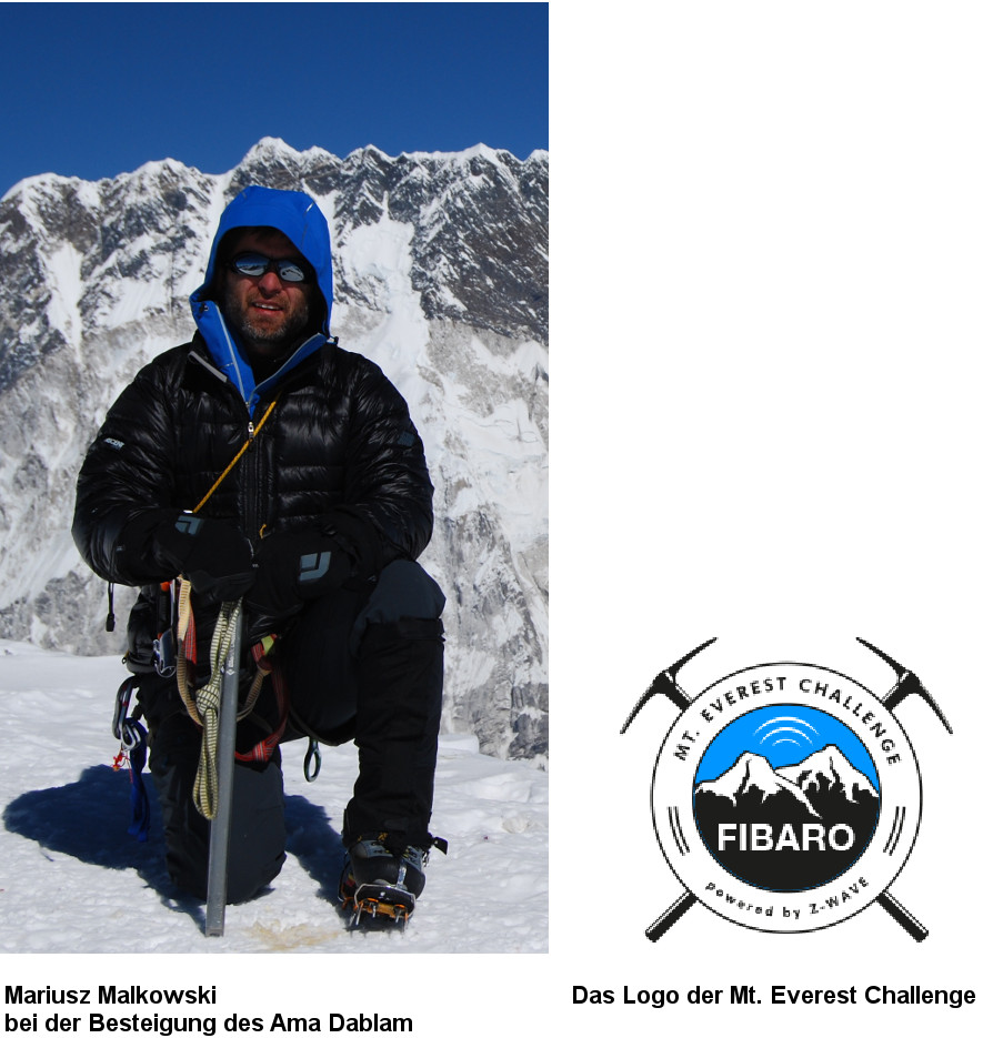 (firmenpresse) - "Home is wherever you are" - unter dieses Motto stellt Home Control-Spezialist Fibaro (http://www.fibaro.com/de) eine spektakuläre Aktion: Bergsteiger Mariusz Makowski wird den Mount Everest erklimmen und vom höchsten Berg der Welt ein Smart Home-System in New Jersey (USA) steuern. Im Rahmen der "Mt. Everest Challenge powered by Z-Wave" startete er am 4. April und wird gegen Ende Mai zurückerwartet. Vom Everest Base Camp in 5.364 m Höhe steigt Makowski bis auf das "Dach der Welt" auf 8.848 m. Über das Internet wird der Sportler dann die Funk-Komponenten von Fibaro per Smartphone bedienen und z.B. zu Hause die Heizung regeln oder die Beleuchtung einschalten.