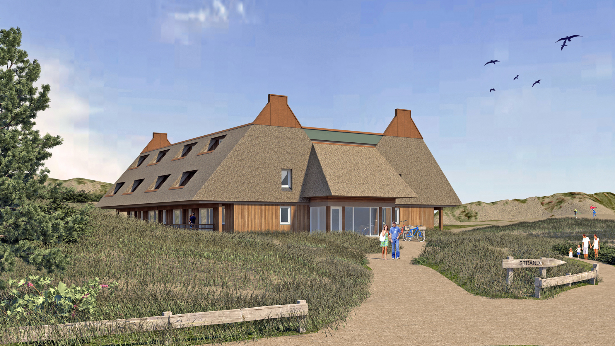 Das reetgedeckte Gebäude des Neubaus fügt sich naturnah in die Dünenlandschaft ein. Bau und Betrieb der Ferienwohnungen entspricht den Vorgaben des Green-Key-Zertifikats. Green Key garantiert nachhaltige Unterkünfte im Hotelsektor. Verantwortungsvoller Umgang mit Ressourcen zeigt sich auch bei der Strand-Dusche, die mit Solarenergie betrieben wird. Jeder Gast erhält für die Dauer seines Aufenthalts eine Strandliege oder einen Zwei-Personen-Strandkorb.
