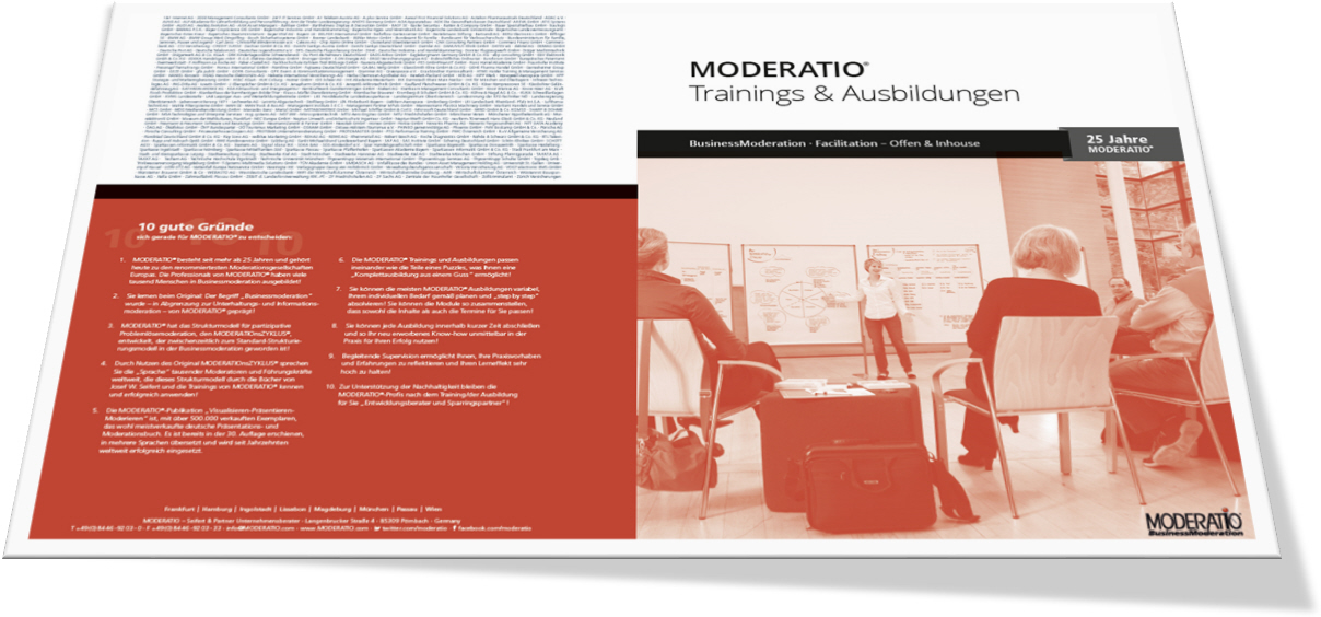 MODERATIO® ist eine 1985 gegründete Unternehmensberatung für BusinessModeration mit den Unternehmensbereichen MODERATIO CONSULTING und MODERATIO AKADEMIE und den Standorten Frankfurt, Hamburg, Ingolstadt, Lissabon, Magdeburg, München, Passau und Wien.
