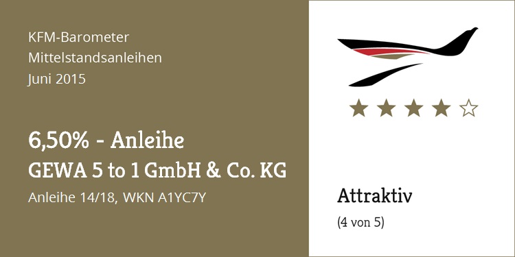 Die im März 2014 emittierte Mittelstandsanleihe der GEWA 5 to 1 GmbH & Co. KG hat einen Zinskupon von 6,50% (Zinstermin 24.03.) und eine Laufzeit bis zum 24.03.2018. Im Rahmen der Anleiheemission wurden insgesamt 35 Mio. Euro eingesammelt. Die Mittel der Anleihe dienen der Projektfinanzierung zur Errichtung des GEWA-Towers in Fellbach bei Stuttgart. Die Emittentin ist berechtigt, die Anleihe mit einer Kündigungsfrist von mindestens 30 Tagen zum 24.09.2016 oder 24.03.2017 zu 102% des Nennbetrages oder zum 24.09.2017 zu 101% des Nennbetrages vorzeitig zu kündigen und diese zum Kündigungstermin in Höhe des vorzeitigen Rückzahlungsbetrags zurückzuzahlen. Abgesichert ist die Anleihe mit einer Grundschuld auf das zu bebauende Gelände.