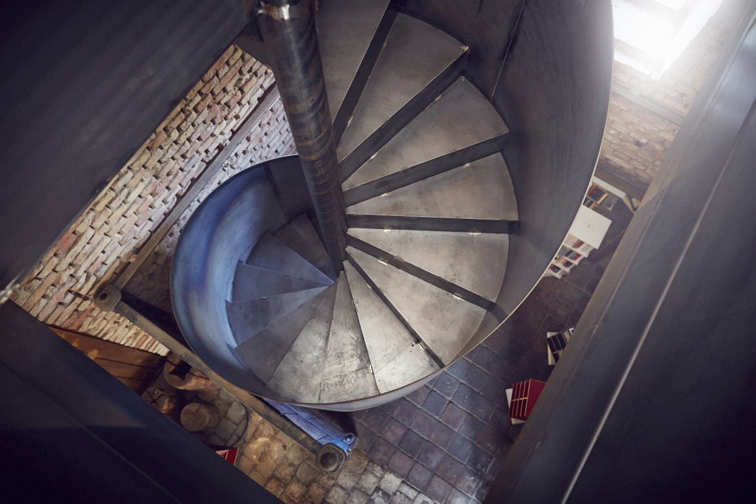 Was diesen historischen Räumen fehlte war eine Treppe zur Erschließung des ersten Stocks. Die hat er jetzt. Aus Stahl. Vom Treppenbauer spitzbart treppen. Keine einfache Aufgabe, denn als Bedingung galt es, das Bauwerk als historisches Kulturgut zu erhalten. Und den hohen Anspruch von Nils Holger Moormann an eine Treppenlösung nach seinem Gusto zu erfüllen: bedeutsam, reduziert auf das Wesentliche und mit klarem Blick nach oben.