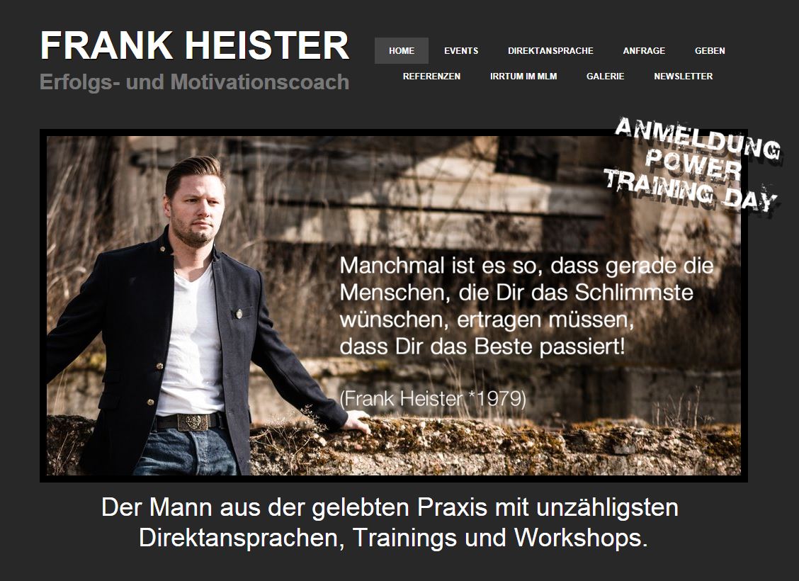 Trainer und Coach Frank Heister ist ein aufstrebender Network Marketing Trainer, der beides offenbart: gelebte Praxis und sein eigenes Angebot an Trainings für Direktansprache bzw. Direktkontakt, Trainings rund um das Thema Sponsern und Einwandbehandlung, dem richtigen Einladen aus der Namensliste, aber auch neue Strategien für Kaltakquise bzw. Kaltkontakte. Mit Seminaren in Deutschland, Österreich und der Schweiz hat Frank Heister die Network Marketing Branche um einige neue Facetten bereichert. Er ist ein Mann, der nicht nur redet, sondern auch ganz klar ein Macher ist und praktisch herausragende Erfolge aufweisen kann. In den vergangenen Jahren hat Heister selbst große Downlines aufgebaut und dabei weder Aufwand noch Mühen gescheut.