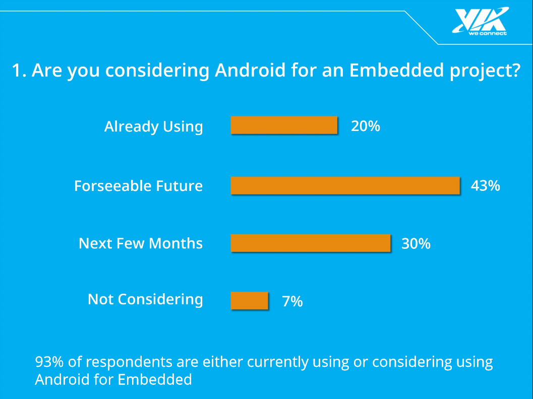 - Eine überwältigende Mehrheit von 93% der Umfrageteilnehmer gab an, dass sie entweder in laufenden Embedded-Projekten Android verwenden oder dies für Projekte in naher Zukunft bereits erwägen.