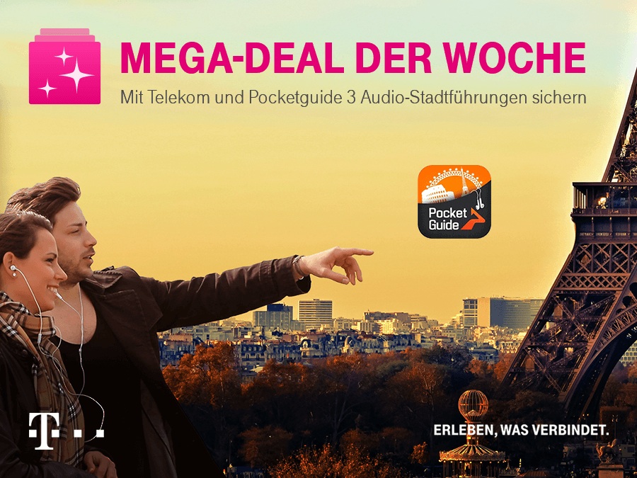 (firmenpresse) - Telekom Mega-Deal geht in die zweite Runde. Das exklusive Vorteilsprogramm der Telekom und ihrer Partner startete vergangene Woche mit einem 20-Euro-Fahrtgutschein von mytaxi und bietet wöchentlich einen neuen Mega-Deal auf www.telekom.de/megadeal. Ab Mittwoch, 08. Juli, erwartet Telekom Mobilfunk- und MagentaEINS-Kunden ein Angebot des Audio-Stadtführers PocketGuide: drei kostenlose Audio-Stadtführungen im Wert von über 15 Euro.
