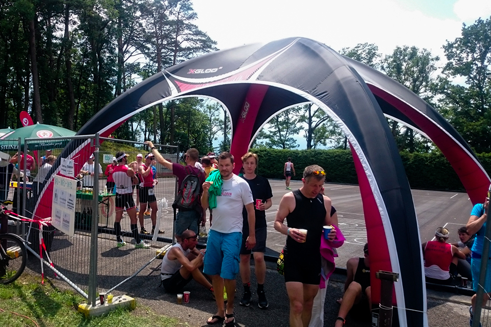 Mit dabei war das trendige X-GLOO Zelt des Chiemgauer Herstellers Skywalk. In Kooperation mit Skywalk hatte der Veranstalter wechselszene Sportpromotions gleich drei 6x6 X-Gloos im Einsatz. Das igluartige Eventzelt spendete den einlaufenden Teilnehmern im Zielbereich Schutz vor Sonne und Regen.