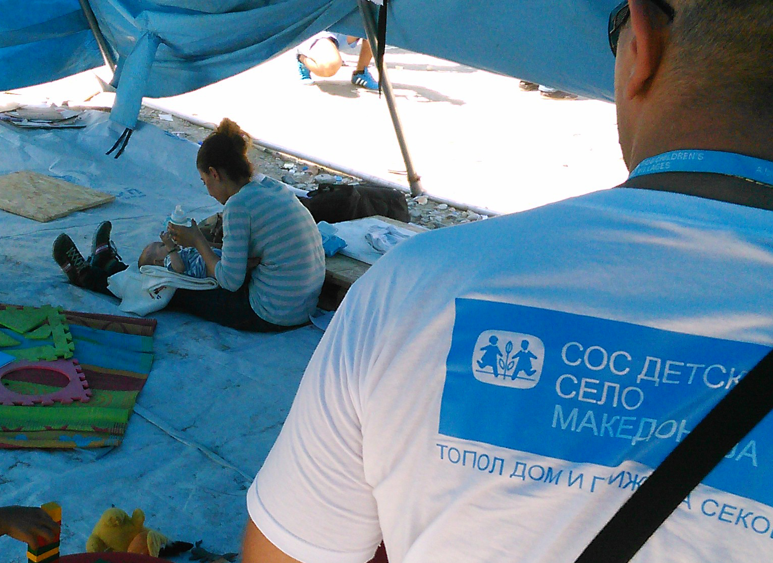 Selbst dem Baby merkt man die Erschöpfung der vergangenen Tage an. Seine Arme und Beine sind sehr dünn und sehen so schwach aus, als ob sie aus Gummi wären. Seine Augenlider bewegen sich immer wieder schnell hoch und runter, als ob er vor irgendetwas Angst hat. SOS-Mitarbeiterin Katerina Ilievska entdeckt den Jungen und spielt mit ihm. Das gefällt ihm. Kurz darauf ergreift er ihre Hand und hält einen ihrer Finger fest. Es ist ein schwaches Halten. Als sie über seinen nackten Fuß streichelt, fängt er laut an zu glucksen. ?Schön, dass Du lachst, kleiner Lausbub?, sagt Ilievska strahlend zu ihm. Auch die Mutter lächelt und wird etwas zugänglicher zu der SOS-Mitarbeiterin. Sie hebt das T-Shirt des Jungen hoch und zeigt eine gerade erst verheilte Narbe auf der Brust des Jungen. ?Er hatte eine schwere Herzoperation in Syrien?, sagt sie.