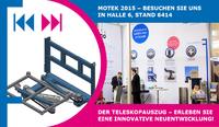Auch auf der 34. Motek 2015, der internationalen Fachmesse für Produktions- und Montageautomatisierung, präsentiert die Alfatec GmbH Fördersysteme in Halle 6, Stand 6414 wieder Neues, Wissenswertes und Faszinierendes zum Thema Förder- und Hebetechnik. Neben qualitativ hochwertigen Führungsrollen, -profilen und individuellen Handlingsystemen präsentiert Alfatec dieses Jahr als Höhepunkt ein neuartiges Teleskop: Der Teleskopauszug kann mit sehr kleinem Bauraum maximalen Verfahrweg von bis zu 2000 mm bewerkstelligen. Alfatec realisiert das Teleskop entgegen konventioneller, linearer Auszüge mit einem innovativen Doppelarmsystem.