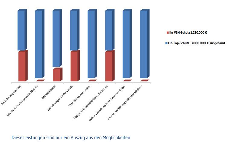 Der ON-TOP-SCHUTZ ist für Inhaber des § 34 d ab 72 ? Jahresbeitrag als VSAV-Mitglied (Jahresbeitrag 60 ?) und für eine kleine Verwaltungsgebühr von 48 ? direkt online nutzbar. In Kürze werden die Zusatzbausteine auch auf www.vsh-netto.de (http://www.vsh-netto.de) verfügbar sein.