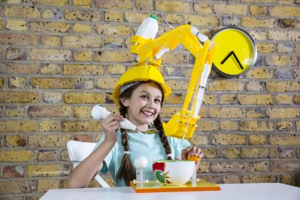 die als persönlicher Assistent mit Roboter-Hand den Kids auf