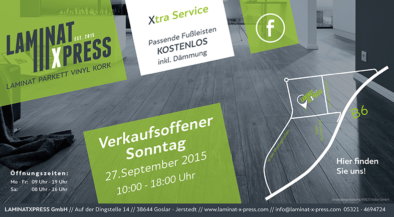 (firmenpresse) - In diesem Monat hat die erste Filiale der LaminatXpress GmbH in Goslar-Jerstedt eröffnet. Mit der regional größten Auswahl an Bodenbelägen im Bereich Laminat, Parkett, Vinyl und Kork wird jeder Kunde fündig. Und nicht nur das - die Fußleisten und die Dämmung sind bei jedem Boden kostenlos enthalten.
