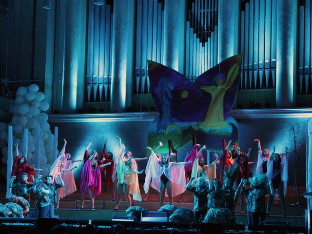 Zeitgemäß schon die Begrüßung. Mit Hartmut Lüling beginnt die Aufführung, indem er Flüchtlingsfamilien und Jugendliche auf die Bühne einlädt und diese herzlich und unter großem Beifall des voll besetzten Saales begrüßt. Symbolisch lässt er die Kunst zu den Menschen der Welt sprechen. Das Spiel dreier kleiner Harfenisten für die Menschen der Welt begleitet zwischendurch immer wieder mit seinem Klang den Abend.
