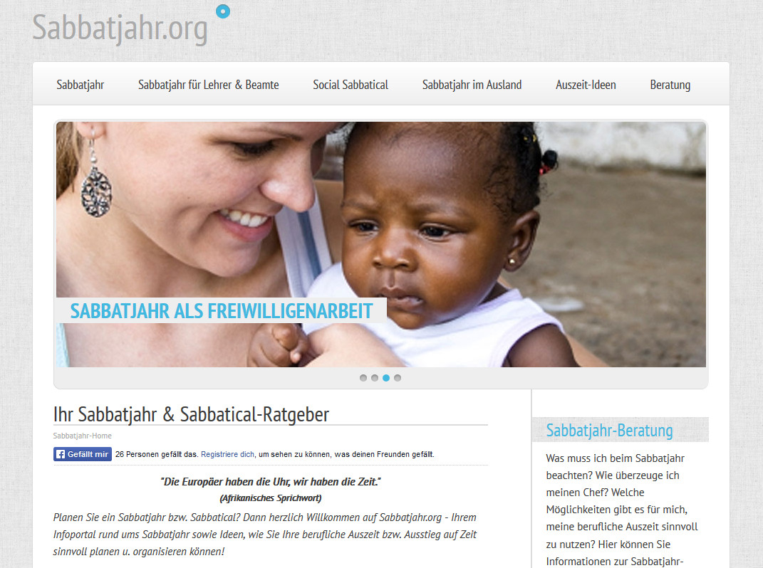 Sabbatjahr.org ist das umfangreichste Informationsportal zum Thema "Berufliche Auszeit". Hier findet man alle wichtigen Infos rund um das Sabbatjahr sowie viele Vorschläge für Auszeiten und Beratungs-Angebote.