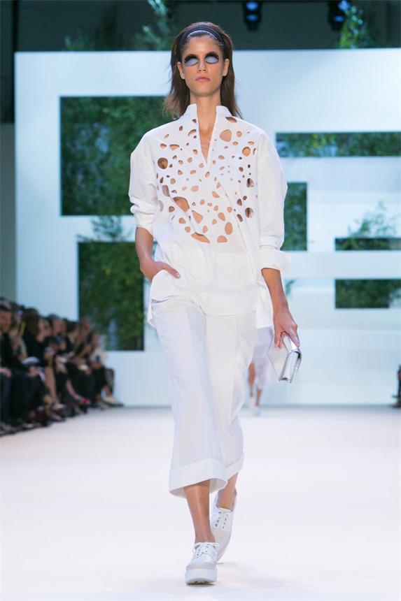 Aber bei Akris, Albert Kriemler seine Muse in die Arbeit des Architekten Sou Fujimoto (wenn Sie selbst es so nennen können) gefunden und verschickt abstrakte geometrische Prints und Schweizer-Käse-wie Ausschnitte in scharfe weiße Baumwoll-Shirts und Hosen; UMSCHALT-Kleider gestuften in eine Pinnwand-Print und blinkende Gugug Quadrat an der Hüfte; und tolle Gold und Silber Hose passt, Sechsecke in der Schuß geätzt. Ob Shorts mit langen halb-Röcke im Vordergrund (eine seltsame Styling-Trick, der aus unerklärlichen Gründen auf andere Start-und Landebahnen sowie geholt hat) eine nette visuelle Struktur errichtet, sind sie wahrscheinlich ein schwer zu verkaufen sein.