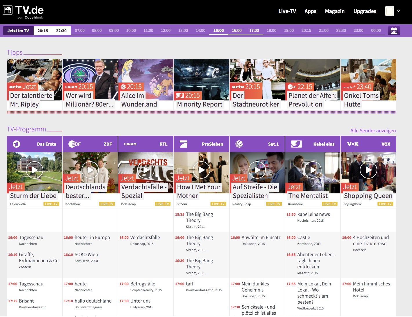 Die Marke TV.de von Couchfunk bietet dem Verbraucher sowohl im Internetportal also auch über die mobile TV App TV.de Live ein vollwertiges Live-Fernseherlebnis, ergänzt um einen komfortablen, intuitiv zu nutzenden elektronischen TV-Programm-Guide. Das bisherige kostenlose, werbefinanzierte Live-TV Senderangebot der 21 öffentlich-rechtlichen Sender wird mit dem neuen Pro TV Paket um die Sender RTL, VOX, n-tv, RTL NITRO, SUPER RTL, RTL II sowie ProSieben, SAT.1, kabel eins, sixx, SAT.1 Gold und ProSieben MAXX ergänzt - ohne zusätzliche Werbeeinblendungen in der App oder auf TV.de. Bis Ende des Jahres liegt der Preis für die Buchung im Web unter Angabe des Rabattcodes VgDDyEV2A lediglich zwischen 9,99 Euro pro Monat und 7,50 Euro bei der Buchung über 12 Monate.* Für Kunden, die das Live-TV-Erlebnis von TV.de ohne weitere Verpflichtung nutzen wollen, gibt es weiterhin das bewährte kostenlose Angebot ohne Anmeldung mit 21 öffentlich-rechtlichen Sendern.