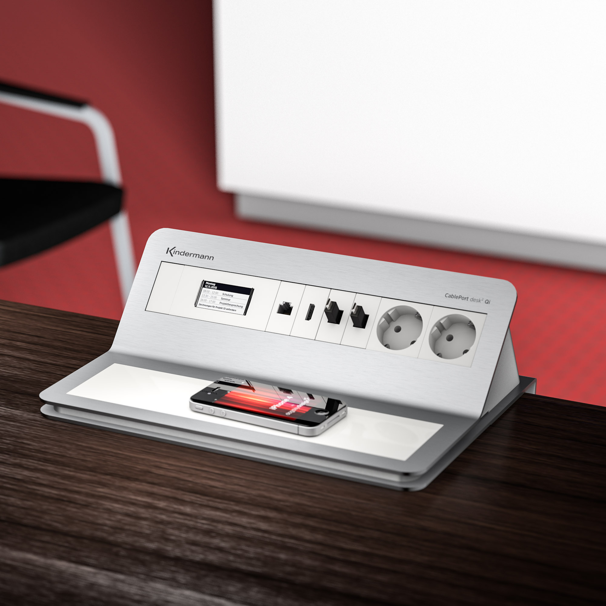 Zum einen das preisgekrönte CablePort desk² Anschluss-System für Strom- und Datenleitungen, das um zwei Modelle erweitert wurde. Das CablePort desk² 80 kann nachträglich in einen 80 mm Kabeldurchlass im Tisch montiert werden, zusätzliche Löcher in teure Tischplatten werden so unnötig. Einfach und praktisch ist, dass sich das Gehäuse in beide Richtungen in 30° Schritten um 150° drehen lässt. Das zweite neue Tischanschlussfeld CablePort desk² Qi enthält neben den Strom-, Medien und Datenanschlüssen eine kabellose Ladestation für Smartphones und ein (optionales) e-Ink Informationsdisplay, über das sich beispielsweise Termine anzeigen lassen. Wer nicht über ein Gerät mit Qi-Ladestandard verfügt, kann sein Tablet auch klassisch per Kabel laden, entsprechende Kabeleinzüge für Micro-USB etc. sind vorhanden.