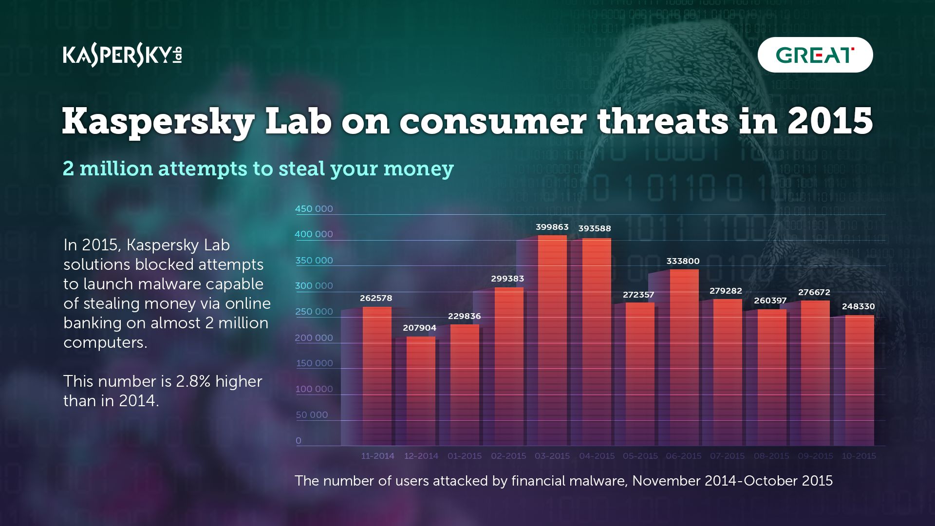 Auch gingen "traditionelle" Cyberbedrohungen im Finanzbereich in diesem Jahr nicht zurück. So blockierten die Lösungen von Kaspersky Lab insgesamt fast zwei Millionen (1.966.324) Versuche, bei denen ein Schädling auf einem Rechner installiert werden sollte, der in der Lage ist, Geld über ein Online-Banking-Verfahren zu stehlen. Im Vergleich zum Vorjahr bedeutet das einen Zuwachs um 2,8 Prozentpunkte. In Deutschland waren 3,8 Prozent der attackierten Nutzer von Kaspersky-Lösungen mindestens einmal im Laufe des Jahres von Bank-Trojanern betroffen.