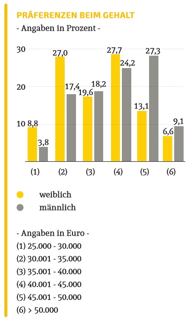 Betrachtet man aber die Gehaltsvorstellungen der weiblichen und männlichen Studienteilnehmer, stößt man auf interessante Aspekte. Auf den ersten Blick fällt auf, dass sich grundsätzlich mehr Frauen in den niedrigeren Gehaltssparten einordnen als Männer. Der Großteil der Frauen wünscht sich demnach eine Bezahlung zwischen 30.001 und 45.000 €. Während die meisten Männer sich erst ab einem Gehalt von 40.001 € zufrieden geben würde. Dieser Ausschnitt der Studie spiegelt ein momentanes Problem auf dem Arbeitsmarkt wider: Die Gehaltsunterschiede! Ein aktuelles Thema, das sich auch hier eindeutig abzeichnet.