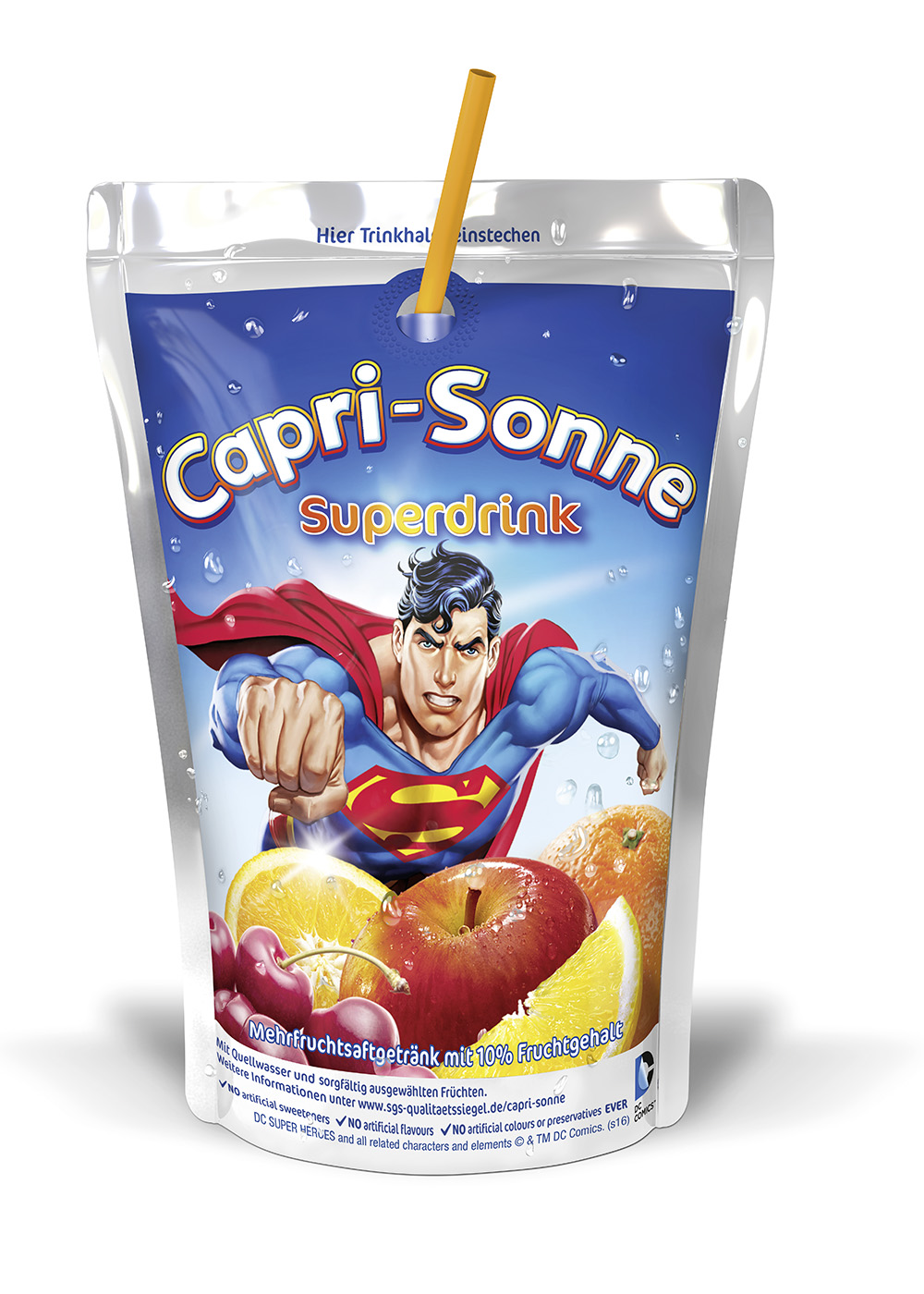 (firmenpresse) - Eppelheim, 02. Februar 2016. Capri-Sonne ist eine Kooperation mit Warner Bros. Consumer Products eingegangen und hat passend zu deren kultigen Superhelden von DC Comics im Januar 2016 die neue Sorte Superdrink in die Regale gebracht, eine fruchtige Mischung aus Äpfeln, Kirschen und Orangen. Der Launch wird von einer multimedialen Kampagne begleitet: Egal ob Online, am POS oder in Form eines TV-Spots - Superdrink garantiert Superhelden-Stimmung auf allen Kanälen. Die neue Sorte ist erstmals ganzjährig in vier verschiedenen Designs im Handel erhältlich.